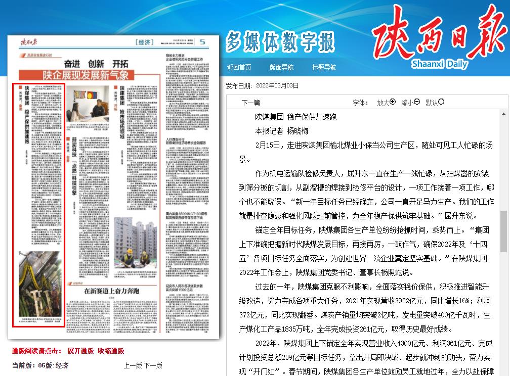 過去的一年,陜煤集團克服不利影響,全面落實穩價保供,積極推進智能升級改造,努力完成各項重大任務,2021年實現營收3952億元,同比增長16%;利潤372億元,同比實現翻番。煤炭產銷量均突破2億噸,發電量突破400億千瓦時,生產煤化工產品1835萬噸,全年完成投資261億元,取得歷史最好成績。